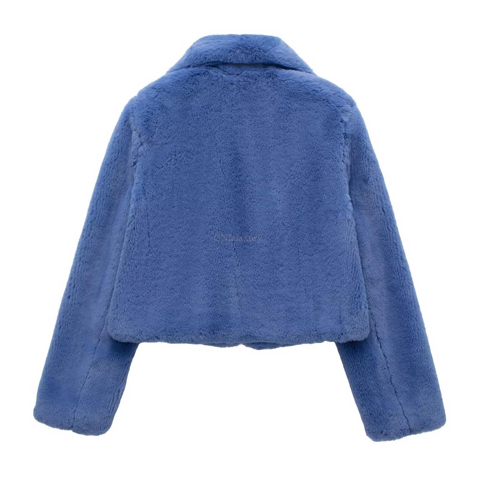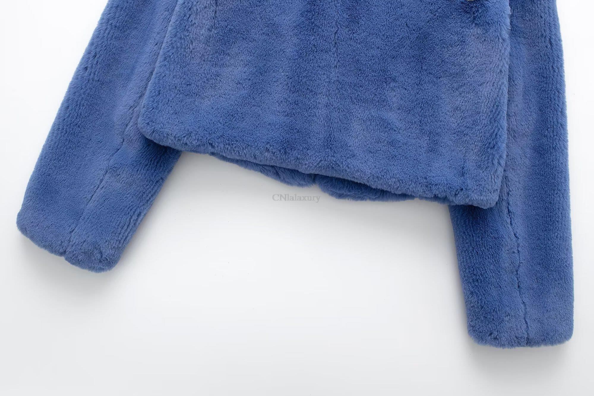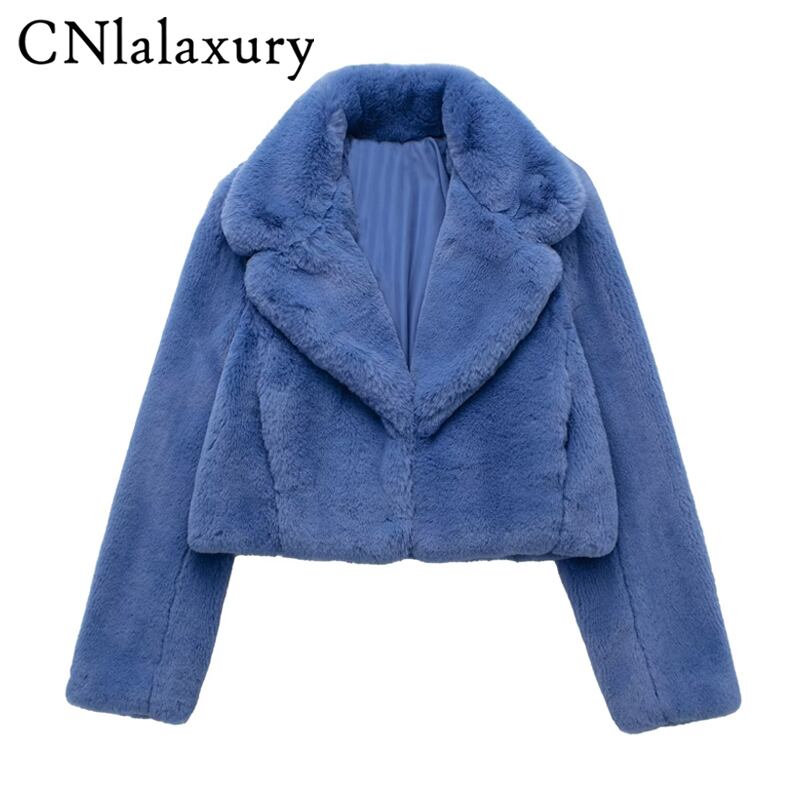 CNlalaxury 秋冬女性ブルーフェイクラビットファージャケット長袖人工毛皮ショートジャケットラペル無地コート ロング オータム 秋物 ウィンター 冬物 ソリッドカラー
