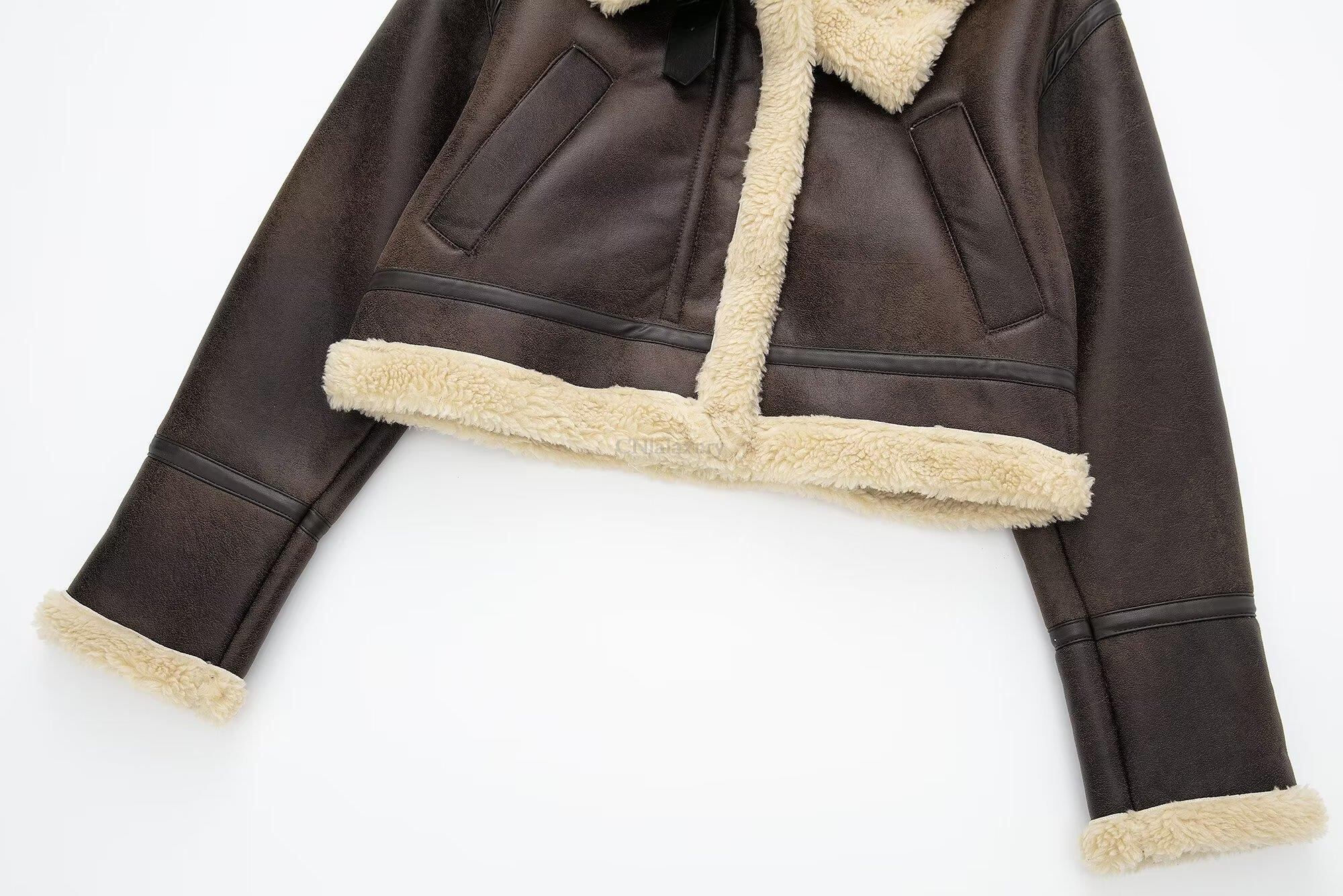 CNlalaxury 冬の女性ブラウンフェイクレザージャケット肥厚長袖オートバイのジャケットショートパッチワークラムズウール ロング ウィンター 冬物 ファー