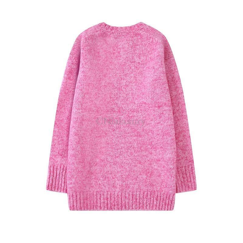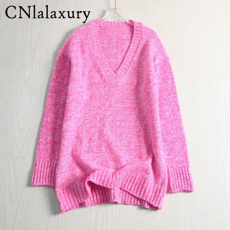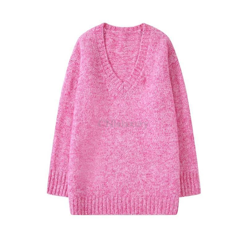 CNlalaxury 秋冬女性ピンク V ネックニットセーター長袖ルーズプルオーバーセーターシンプル無地ジャンパー ロング オータム 秋物 ウィンター 冬物 Vネック ソリッドカラー