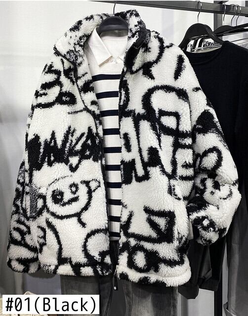 CNlalaxury 秋冬男性印刷ラムウールジャケット長袖厚みグラフィティジャケット男性の上着 ロング オータム 秋物 ウィンター 冬物