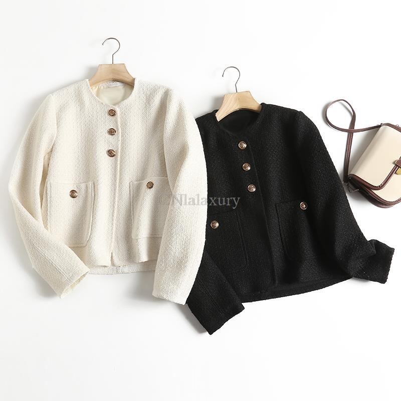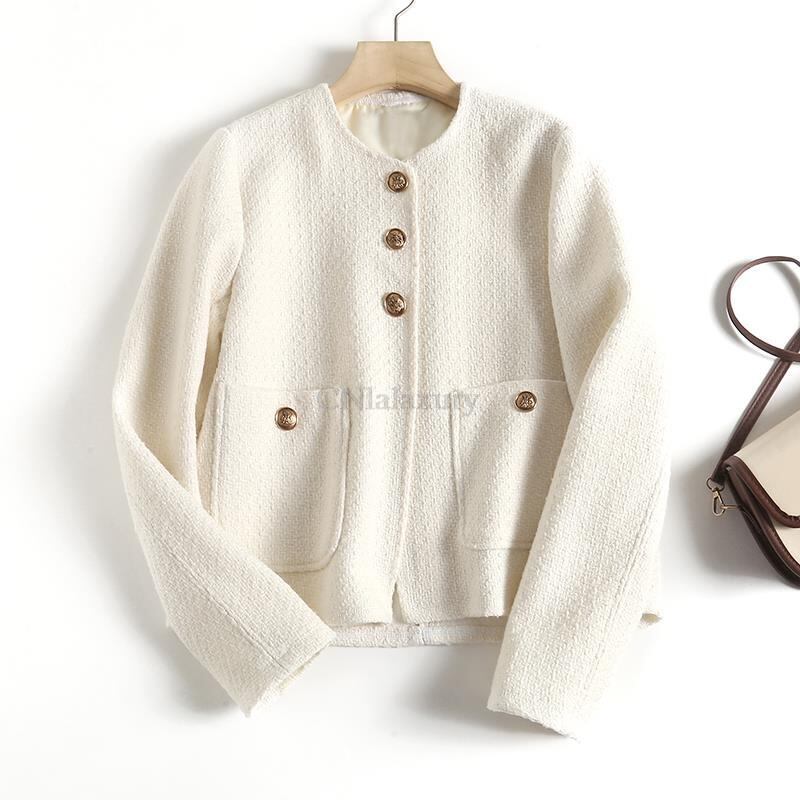 CNlalaxury 秋の女性ミルキークルーネックショートジャケット長袖ダブルポケット上着スリムフィットボタンジャケットトップ ロング オータム 秋物