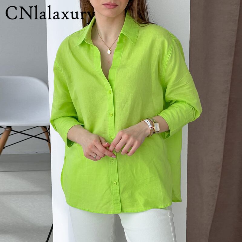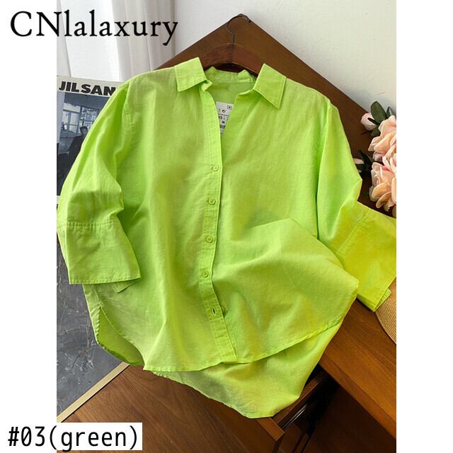 CNlalaxury 女性春夏グリーンカラールーズリネンブラウスオフィスレディシングルブレストシャツシックなトップス スプリング 春物 サマー 夏物 会社 学校 通勤や通学にも