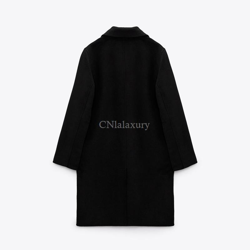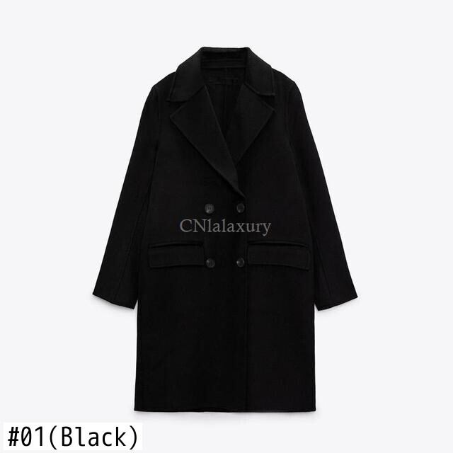 CNlalaxury 秋冬女性ブラックダブルブレストツイードコート長袖ミッドレングス無地ウールコート ロング オータム 秋物 ウィンター 冬物 ソリッドカラー