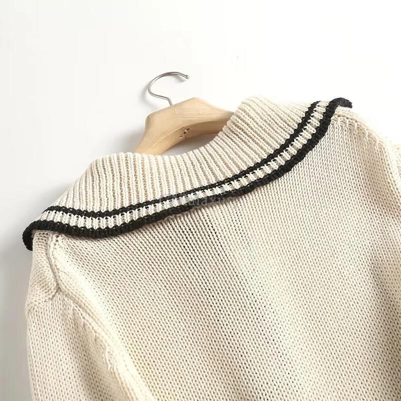 CNlalaxury 女性秋冬大ラペルプルオーバーセーターベージュ金属ボタンシンプルなセーター長袖ニット ロング オータム 秋物 ウィンター 冬物