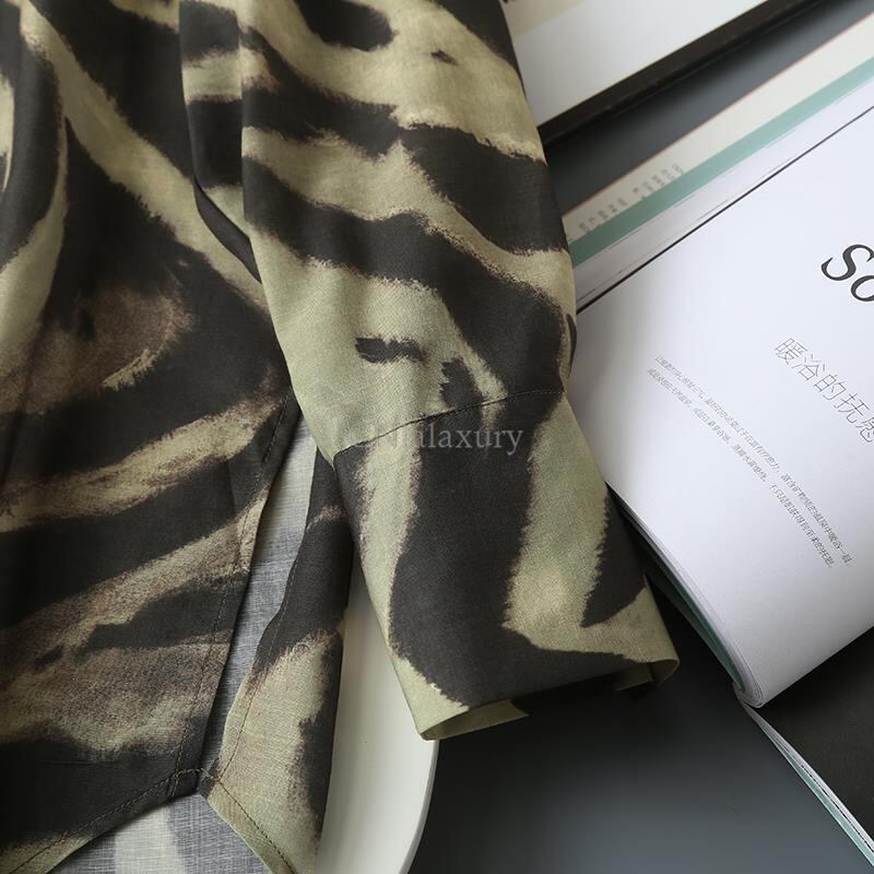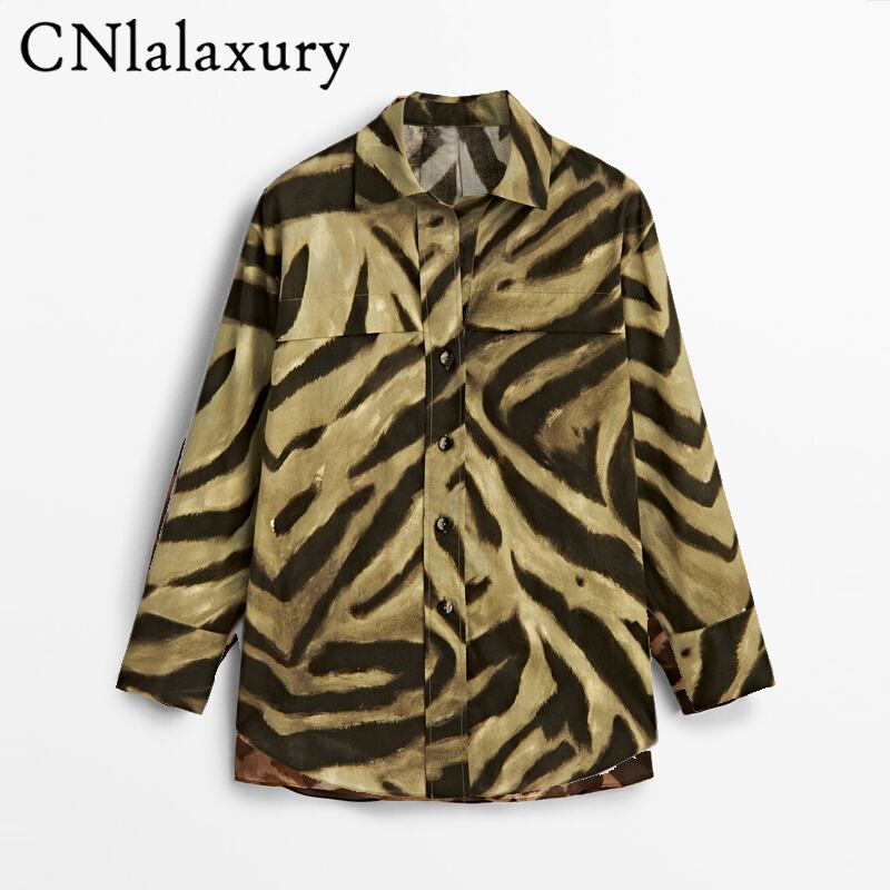 CNlalaxury 秋の女性ブラウスオリーブグリーンゼブラプリントシャツ長袖アニマルプリントブラウスシックな女性トップ ロング オータム 秋物