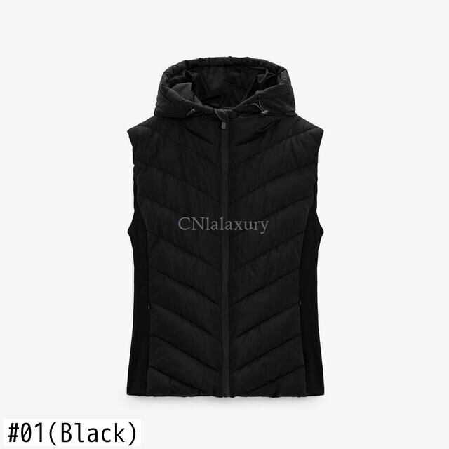 CNlalaxury 秋冬女性ブラックノースリーブベストフード付きシンプルなコットンベストジッパーチョッキ無地トップ オータム 秋物 ウィンター 冬物 ソリッドカラー