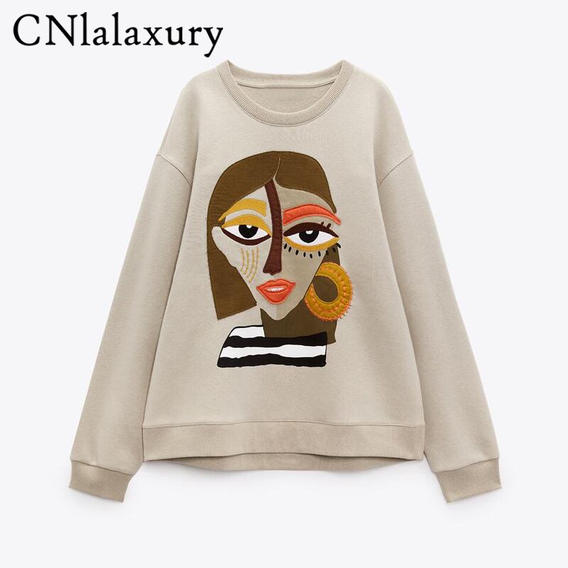 CNlalaxury 秋冬 ベージュ 女性 ラウンドネック スウェットシャツ 長袖 プリント パーカー プルオーバー トップ Sudaderas ロング オータム 秋物 ウィンター 冬物 Oネック