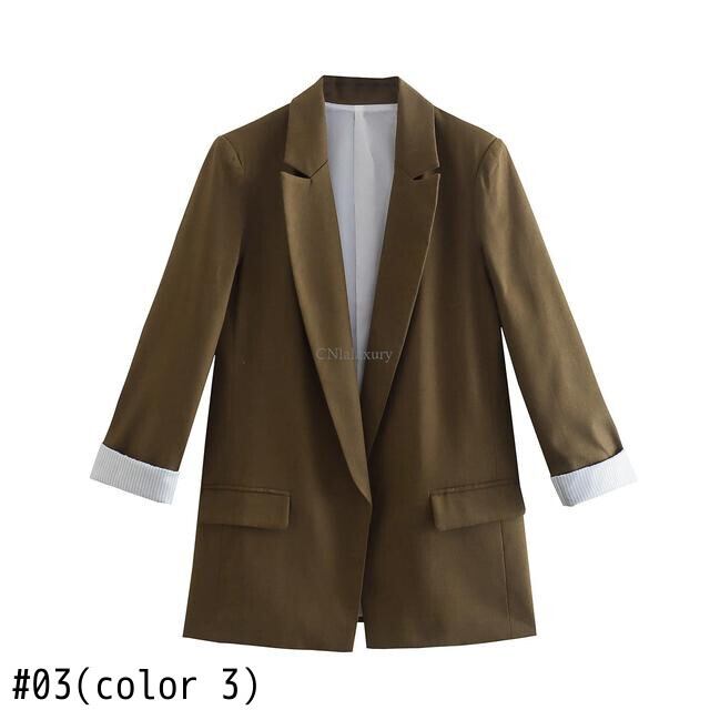 CNlalaxury 秋の女性ベージュスプライシングブレザー長袖オフィスレディオープン前立て上着通勤トップ ロング オータム 秋物 会社 学校 通勤や通学にも