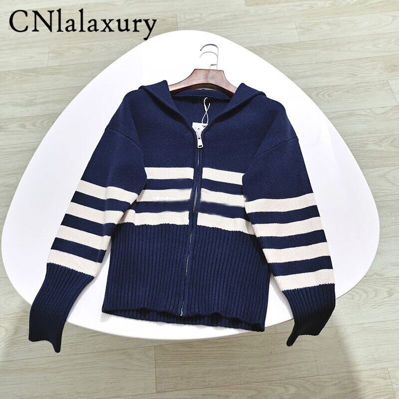 CNlalaxury 女性秋冬ストライプセーター長袖ジッパーカーディガンラージラペルニットセーター ロング オータム 秋物 ウィンター 冬物