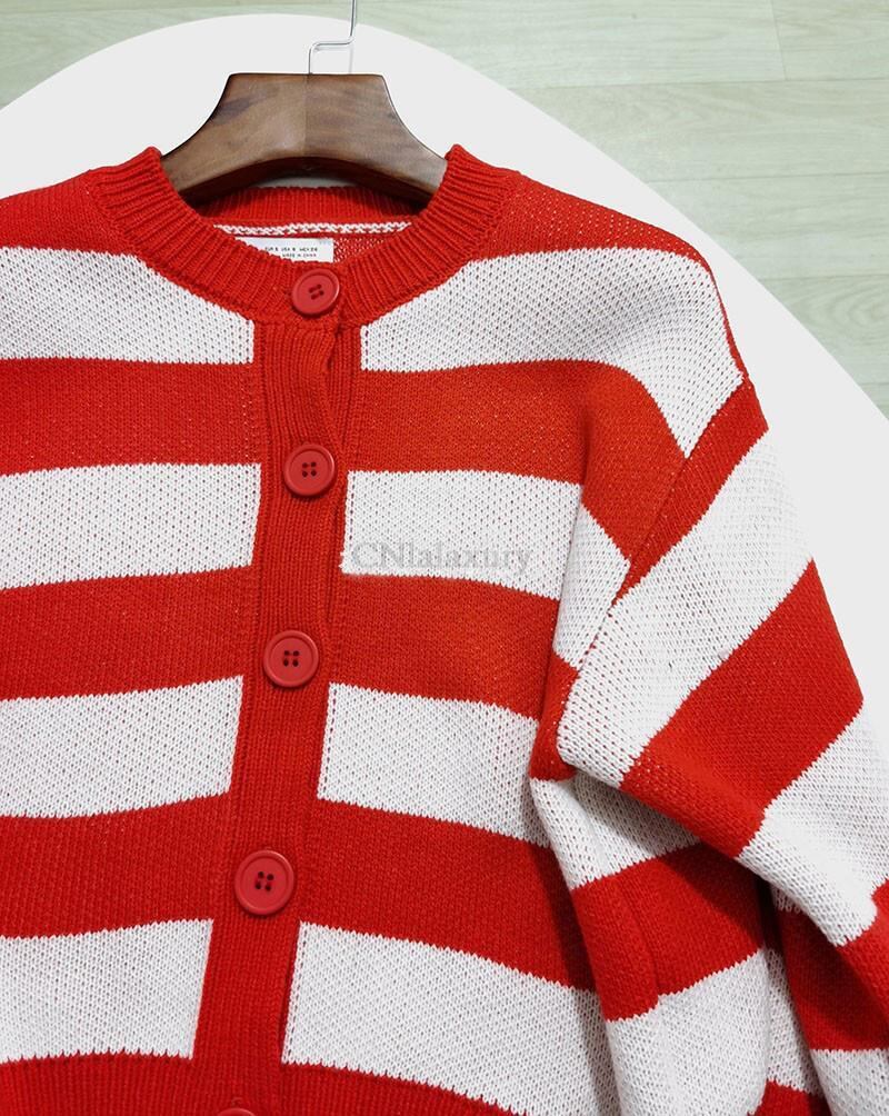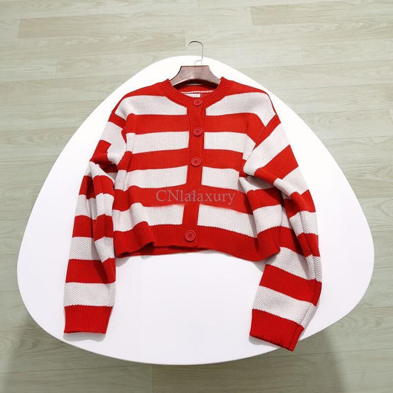 CNlalaxury 秋冬女性レッドストライプセーターラウンドネックロングスリーブショートニットセータースリムカーディガン 長袖 オータム 秋物 ウィンター 冬物 Oネック