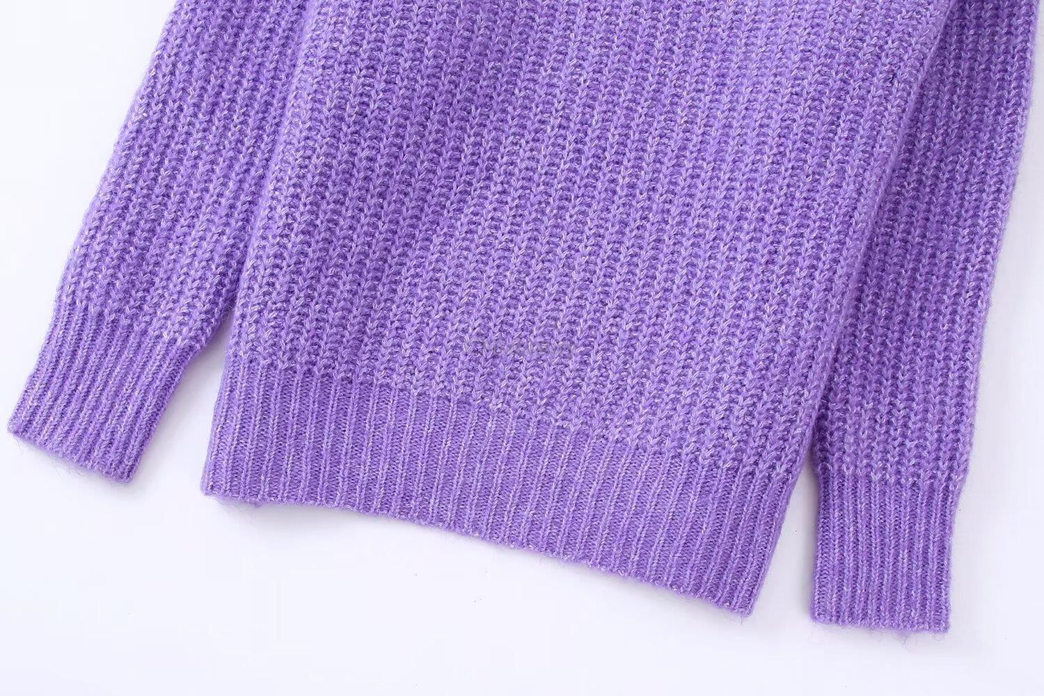 CNlalaxury 冬の女性紫長袖セーターラウンドネックシンプルなプルオーバーセーター無地ニットトップス ロング ウィンター 冬物 Oネック ソリッドカラー パープル