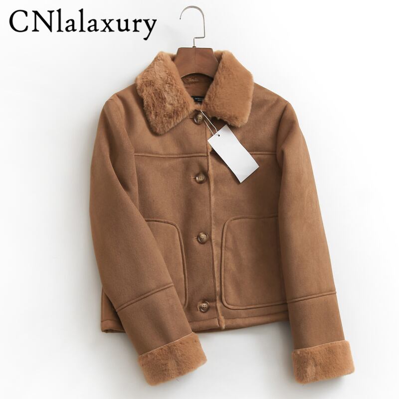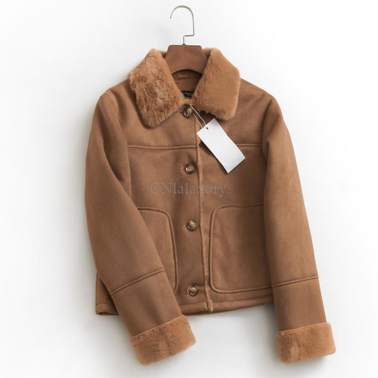 CNlalaxury 冬の女性模倣スエードジャケットフェイクファー裏地コート長袖ショートジャケットポケットアウター ロング スウェード ウィンター 冬物