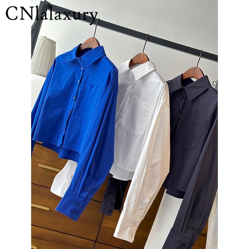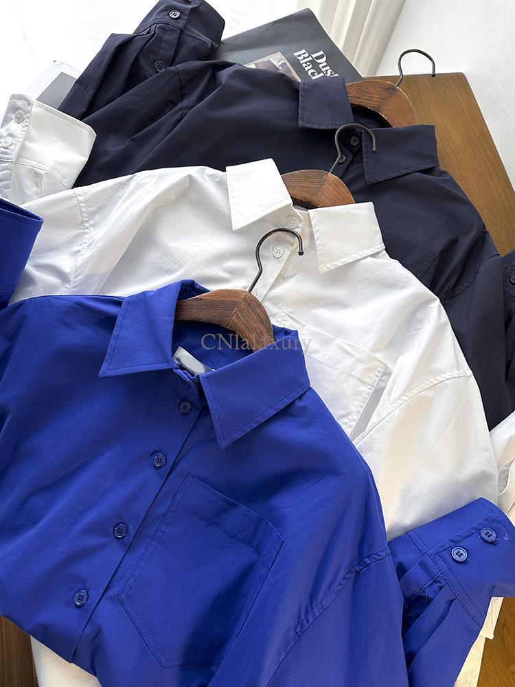 CNlalaxury レディース シンプリーブルー シャツ シングルブレスト ポプリン オフィスレディ 長袖 春 シック ショートブラウス トップス ロング スプリング 春物 シンプル 会社 学校 通勤や通学にも | shy