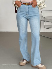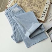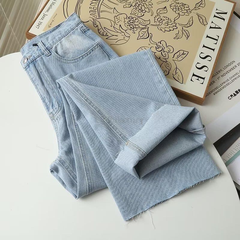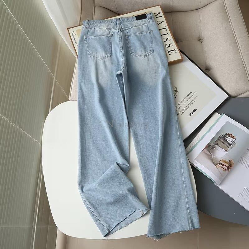 CNlalaxury 秋のライトブルーウエストジーンズ薄い未加工エッジワイドレッグパンツストレートズボンボトム オータム 秋物 ワイドパンツ