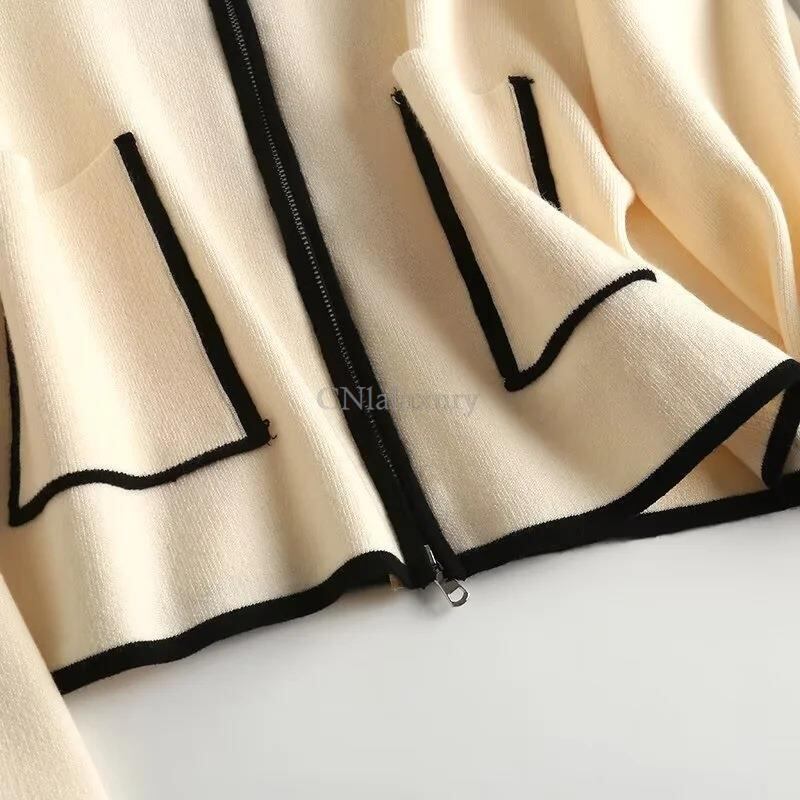 CNlalaxury 秋オフホワイト ショート ジャケット長袖スプライシング スリム フィット カーディガン アウターウェア ポケット シックトップ ロング オータム 秋物