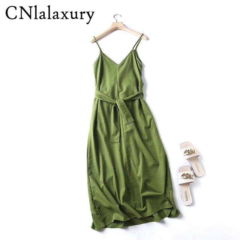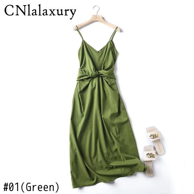 CNlalaxury 夏 V ネック リネン ブレンド ミディ ドレス ノースリーブ サスペンダー ドレス無地スリム フィット Vestidos サマー 夏物 Vネック ソリッドカラー