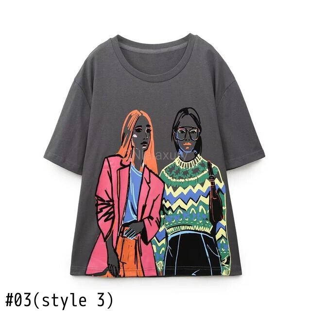 CNlalaxury レディース 春夏 ラウンドネック ルーズガール柄 プリントTシャツ 万能トップス Tシャツ スプリング 春物 サマー 夏物 Oネック