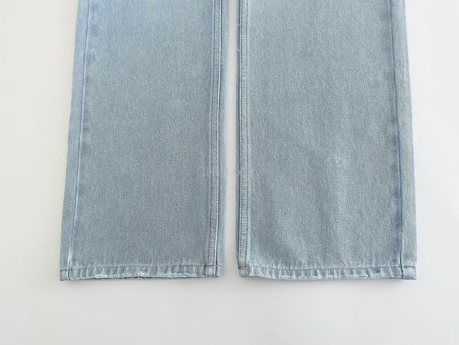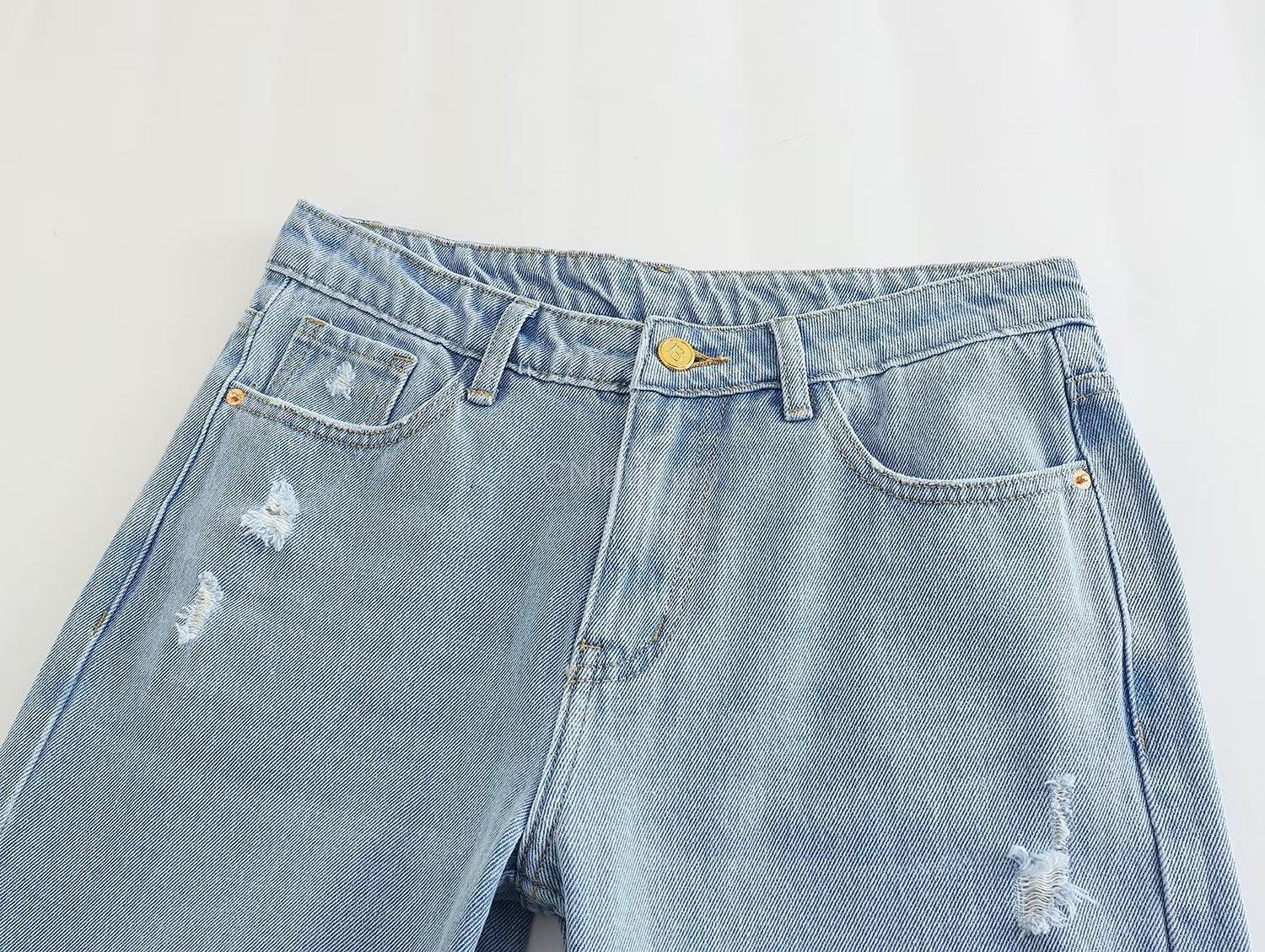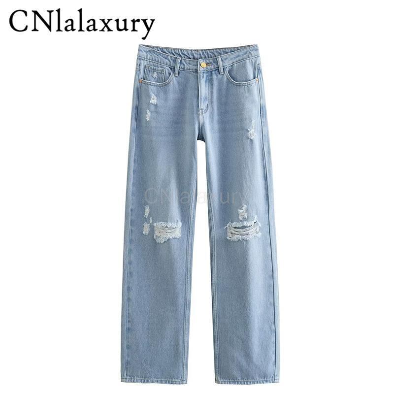 CNlalaxury ブロークンホール装飾ミッドウエストストレートデニムパンツヘアリーエッジジーンズシックズボン